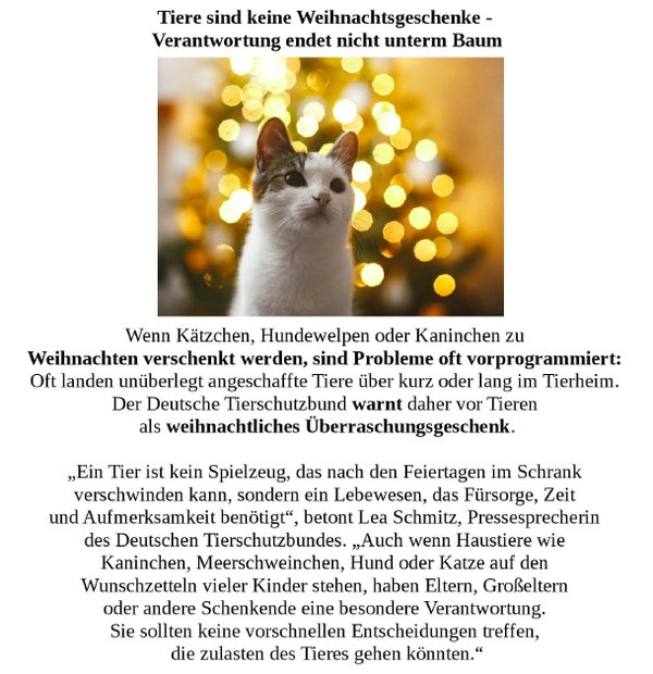 ![]() weitere Infomationen unter: https://www.tierschutzbund.de/ueber...antwortung-endet-nicht-unterm-baum/ |